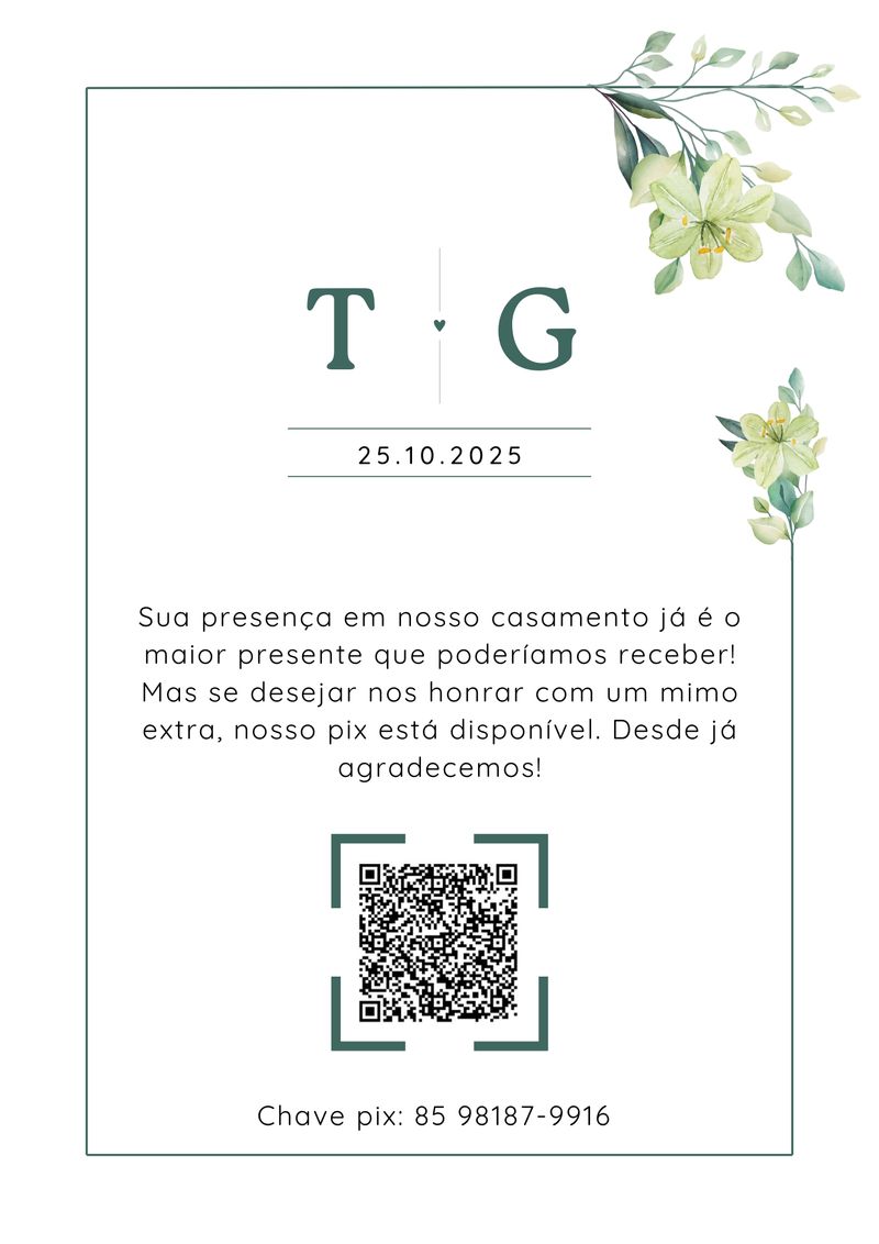 Sua presença em nosso casamento já é o maior presente que poderíamos receber! Mas se desejar nos honrar com um mimoextra, nosso pix está disponível. Desde já agradecemos!